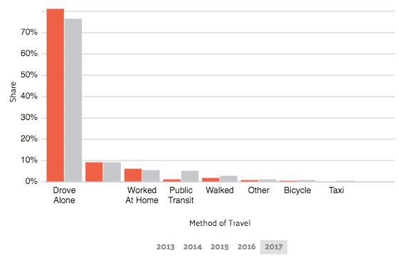 DataUSA reports that a whopping 86.1 percent of North Carolinians drive to work alone.
