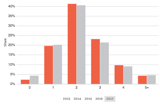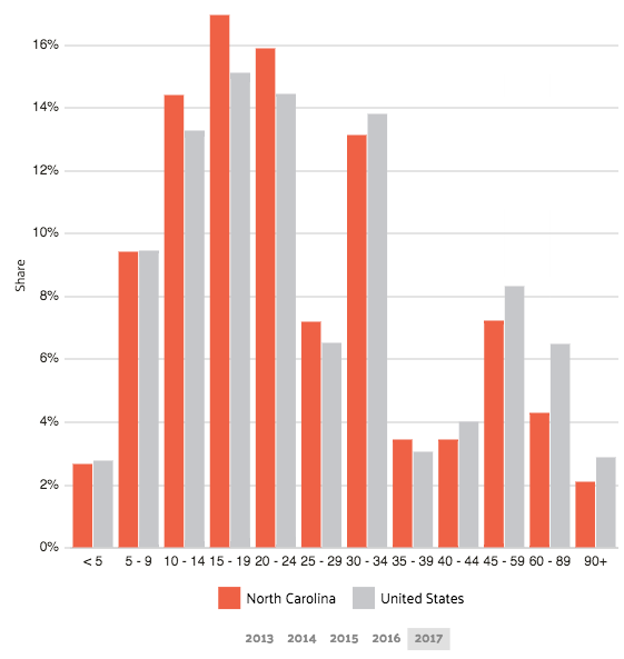 On average, North Carolina households own at least two cars. DataUSA offers this telling graph of how much Tarheelers loved to own vehicles in 2017: